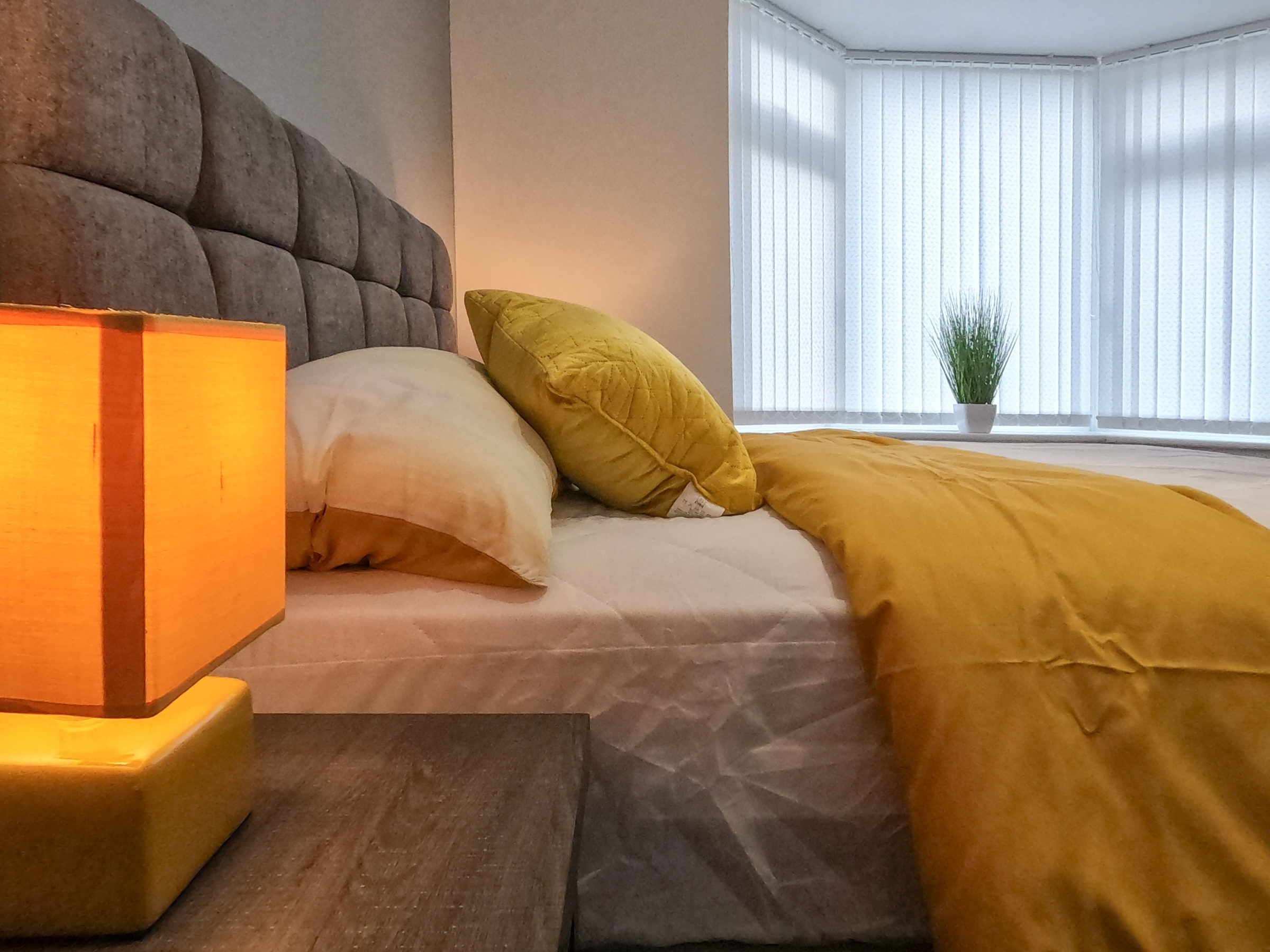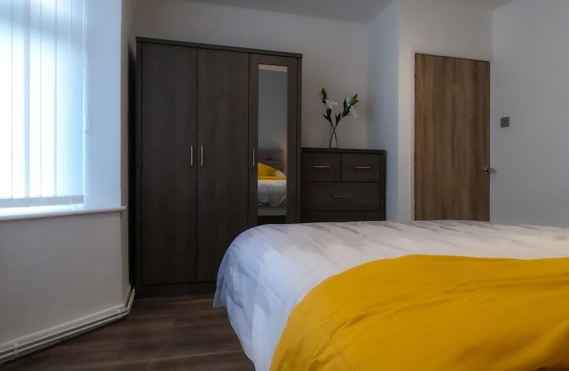 Your Private Space: A generously proportioned room featuring a comfortable bed with fresh linen, ample storage via a large wardrobe, and a dedicated work area with a desk and chair.